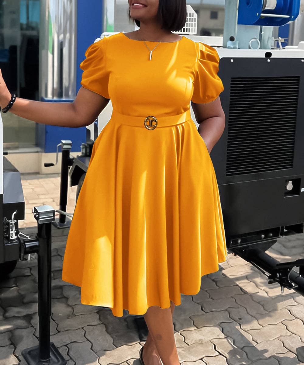Introducing the Elegant Waisted Swing A-Line Dress with Puffy Sleeves Charm, a must-have addition to your wholesale fashion collection. This exquisite dress combines style and comfort, making it perfect for a variety of occasions. Crafted from a premium blend of 95% polyester and 5% elastane, its fabric offers both durability and a flexible fit that flatters every body shape.