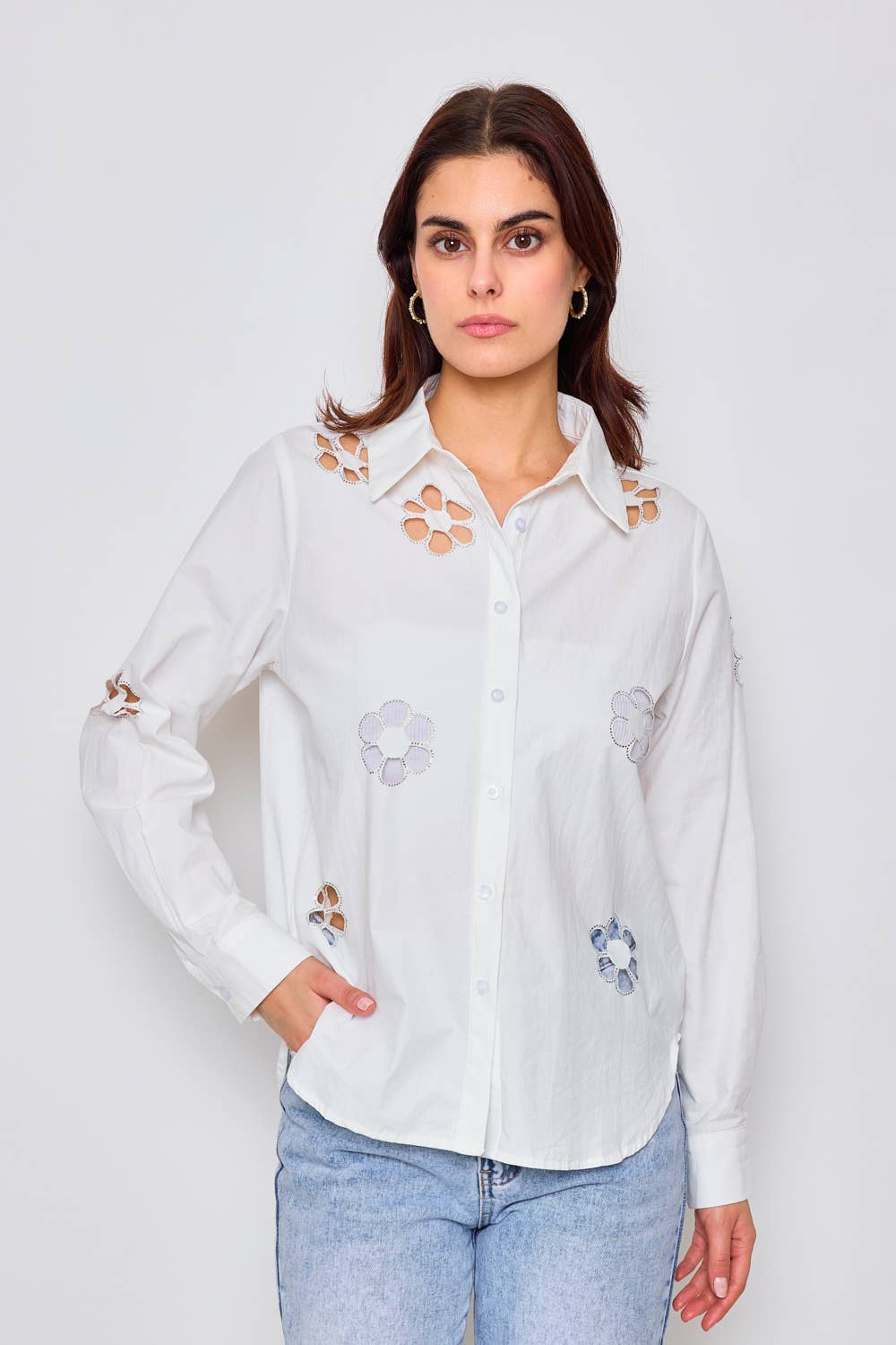 This Frime cotton shirt is appealing for its loose fit, classic collar, front button closure, long sleeves tightened at the wrists, and floral rhinestone details. The model is 1.75m tall and wears a size S/M.