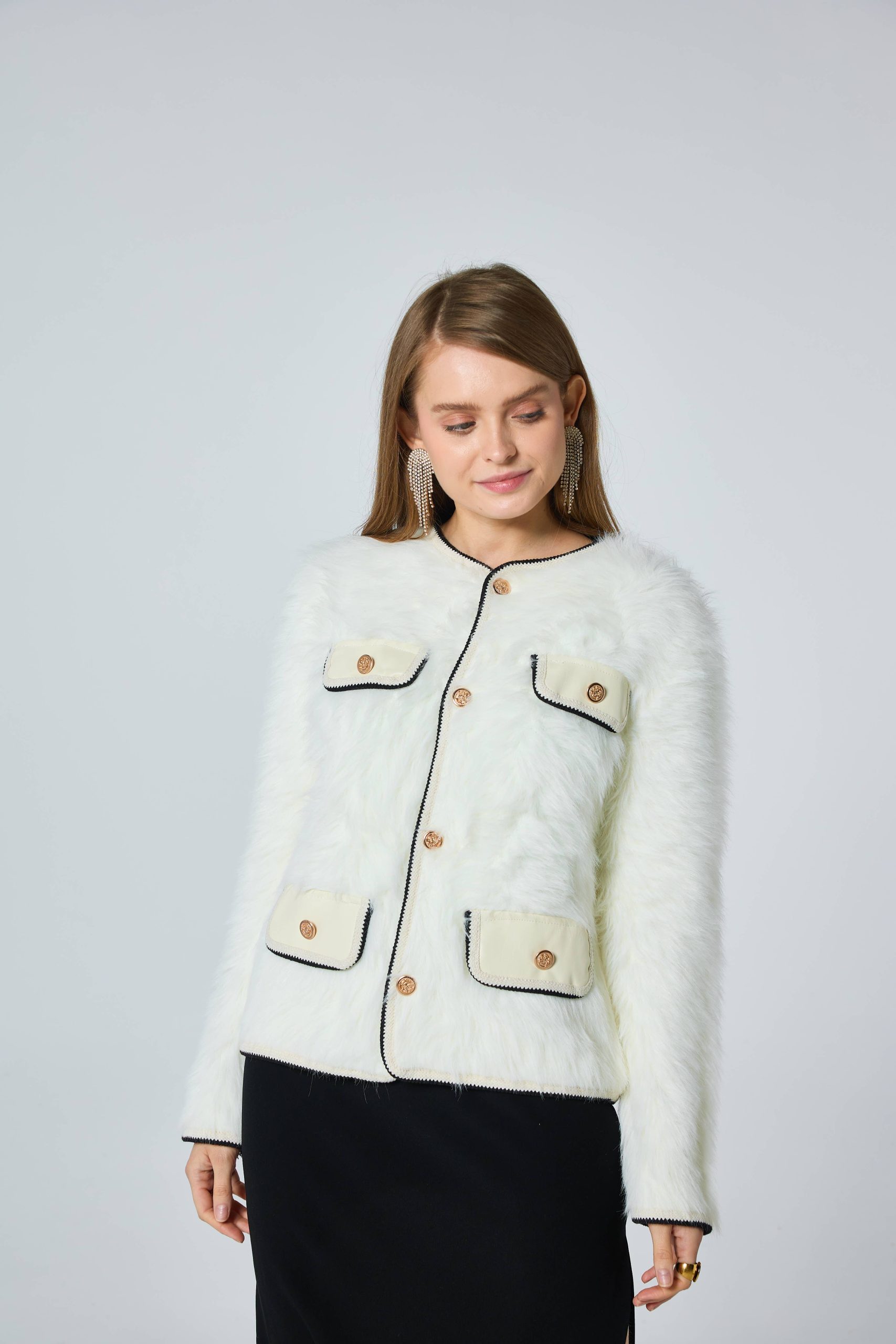 Frime faux fur down jacket with leather pockets and contrasting trim. Long sleeves and gold buttons for a chic and warm look this winter. The model is 1m75 tall and is wearing one size fits all.
